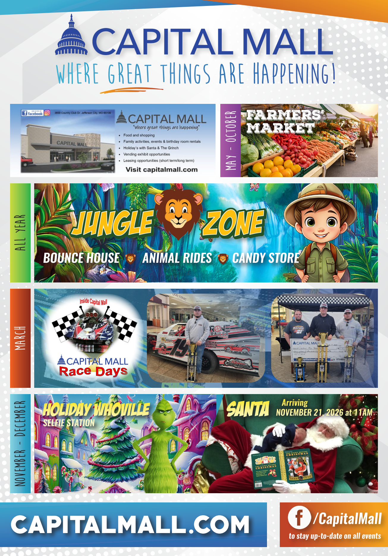 During inclement weather please refer to Capital Mall Facebook page to check status of store closings or late opening due to weather. Capital Mall stores follow their own weather related policies.